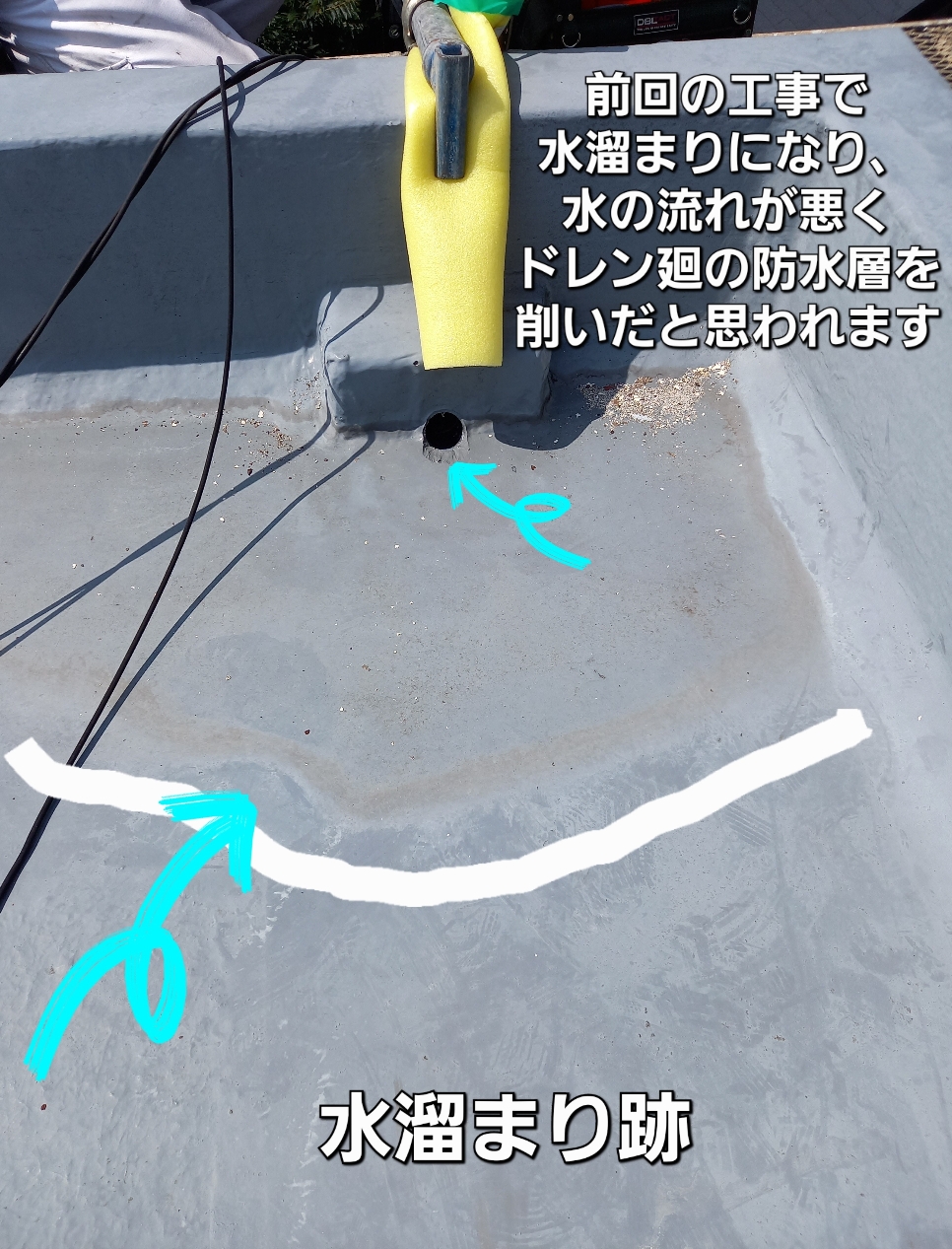 雨漏りは色々な場所でおこります。 原因も、さまざまです。 写真はALCの建物の屋上です。 屋上のすぐ下が雨漏りしています。 考えられる原因は、ドレン廻りの防水層の剥離です。 前回の防水工事で、ドレン廻りの防水層が 厚くなりすぎ…水の流れも悪い為ドレン廻の防水を削ぎ落とした跡がみられます。...